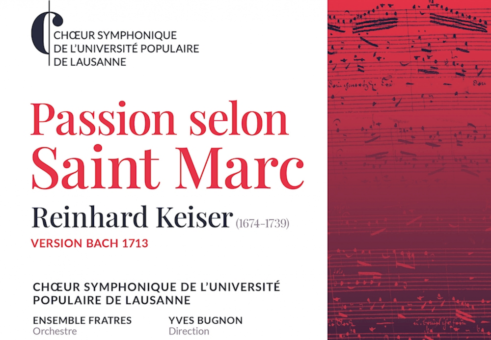 Le Choeur symphonique de l'Université Populaire de Lausanne donne une Passion selon Saint Marc de Reinhard Keiser (1674-1739) accompagné par l'Ensemble Fratres et des solistes solistes Béa Droz, Valentin Bezençon, Pierre Héritier, Pierre Lenoir et Pierre Arpin.
